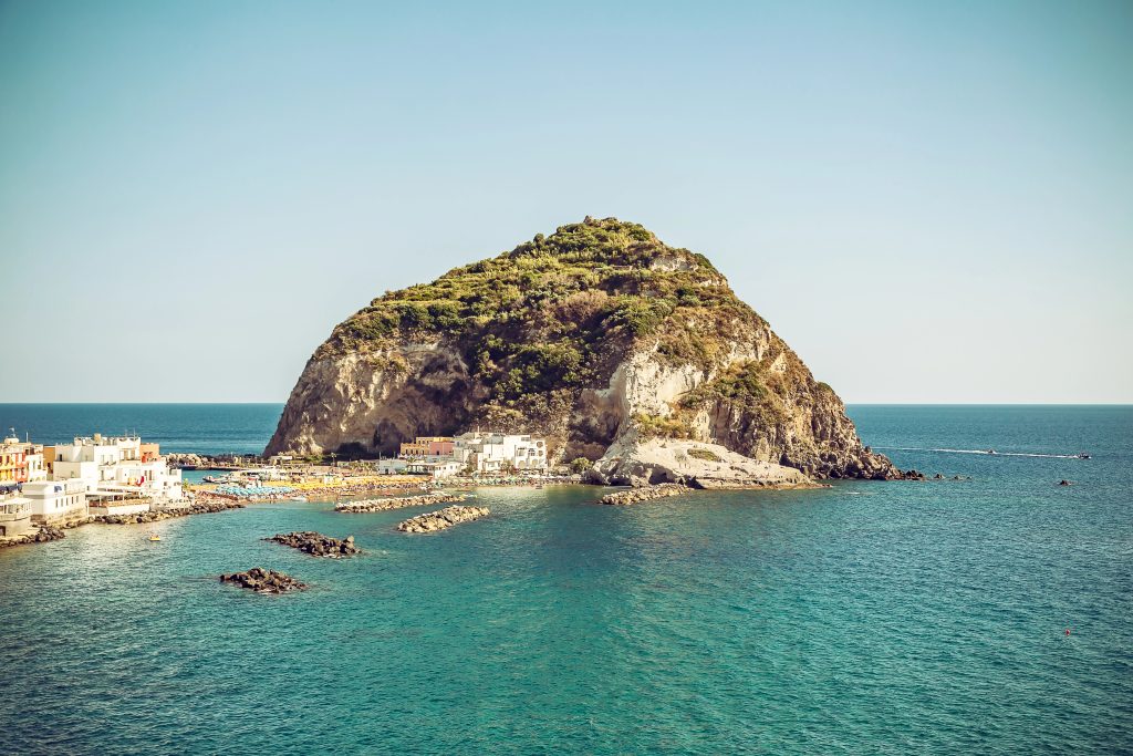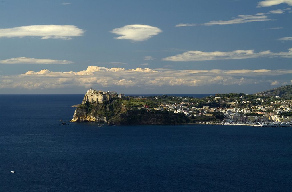 Il Castello Aragonese si staglia maestoso su un isolotto, collegato a Ischia da un sottile ponte di pietra. Dal mare appare come una fortezza sospesa tra cielo e acqua, imponente e affascinante. Le torri e le antiche mura si riflettono sulle acque cristalline, mentre il vento accarezza il volto. Il panorama è unico: il blu intenso che circonda l’isola, le coste verdi che si alternano a scogliere e calette. Guardarlo da questa prospettiva fa sentire l’energia del tempo passato e la bellezza del presente, in un quadro naturale che lascia senza fiato.